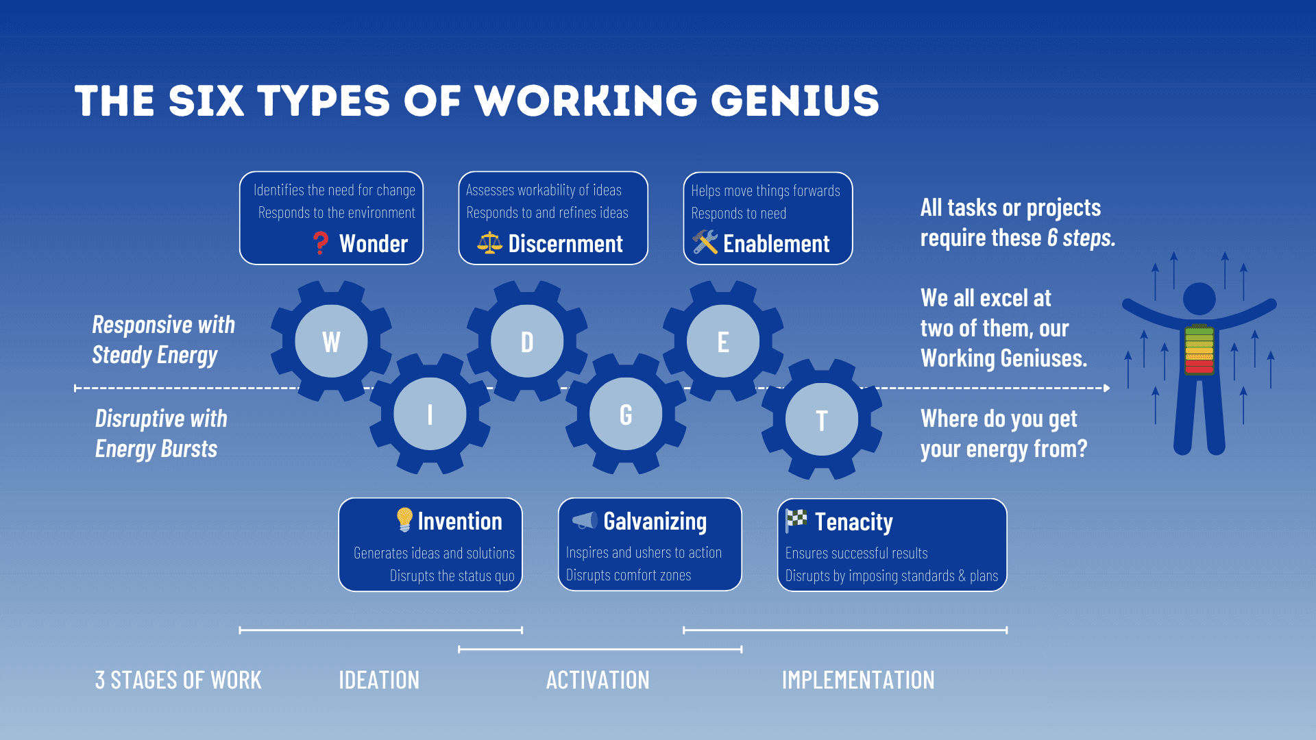 The 6 Types of Working Genius is our preferred method due to its simplicity, actionability, and ease of integration in day-to-day work routines. However, we adapt and tailor our servies to the needs and wishes of our clients and can use other strength identification tools too.